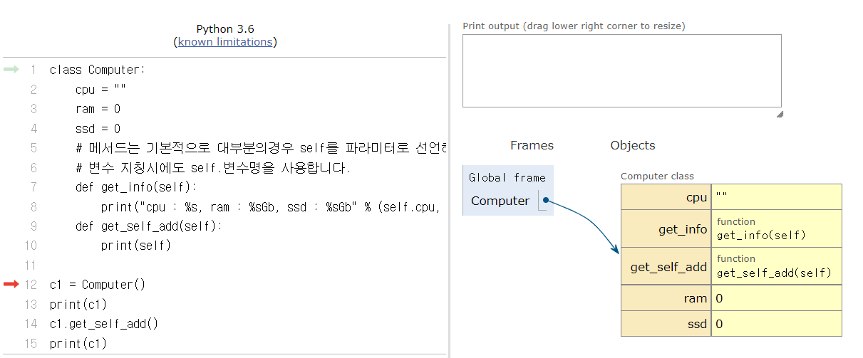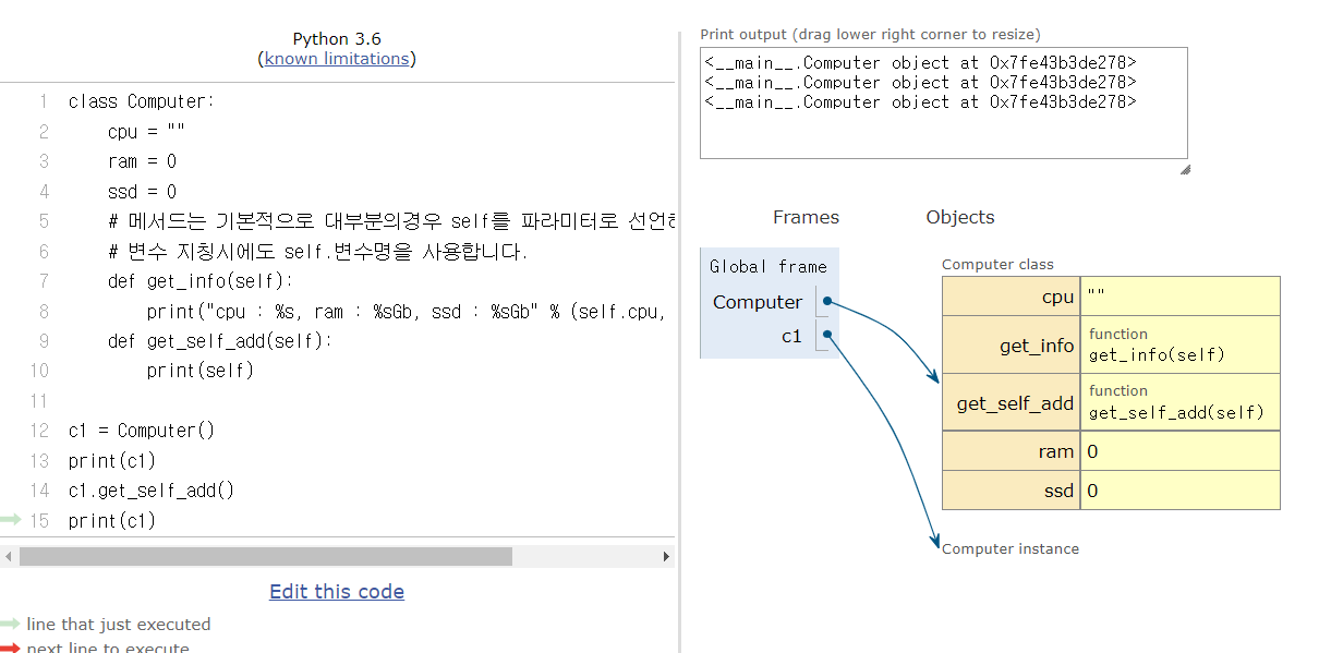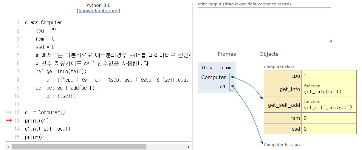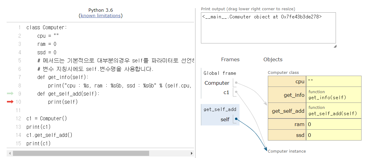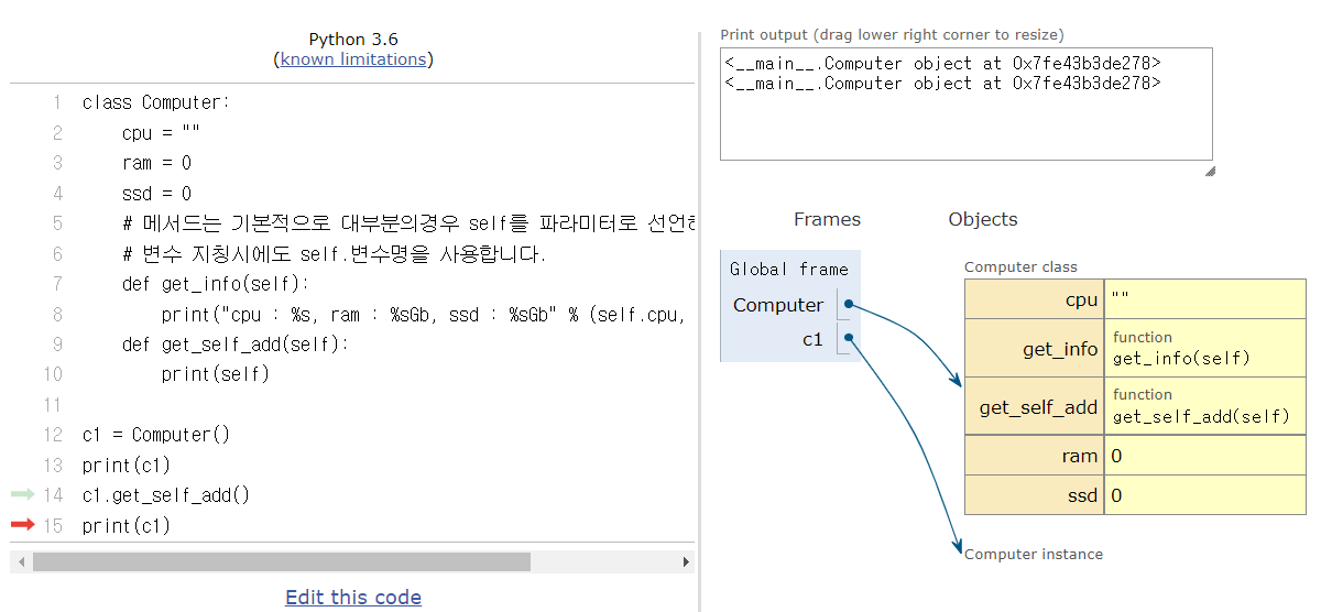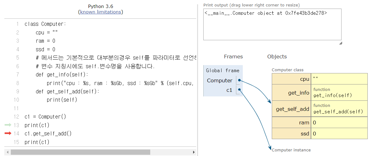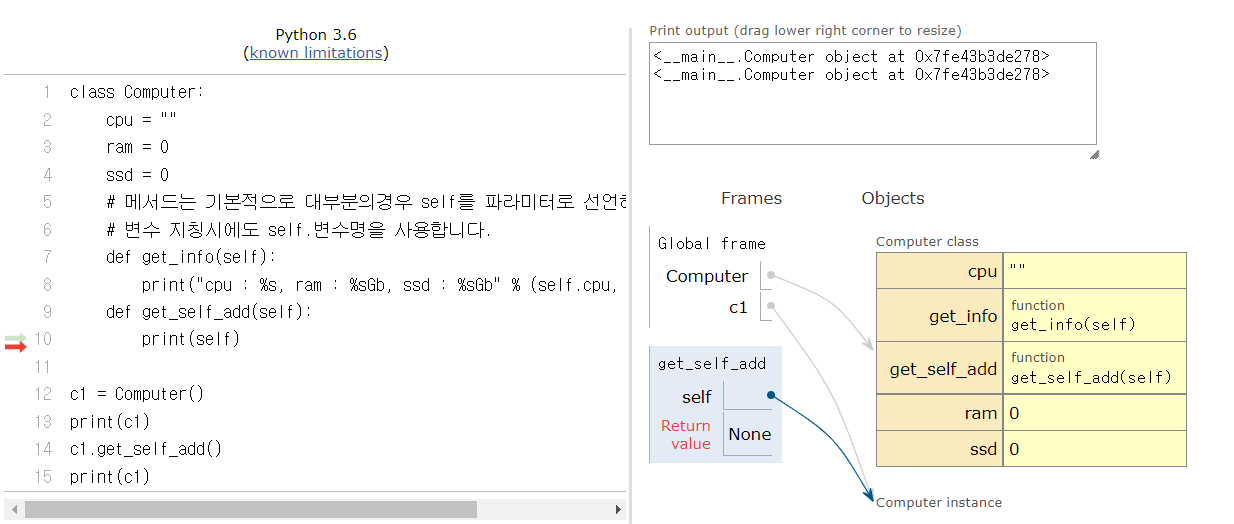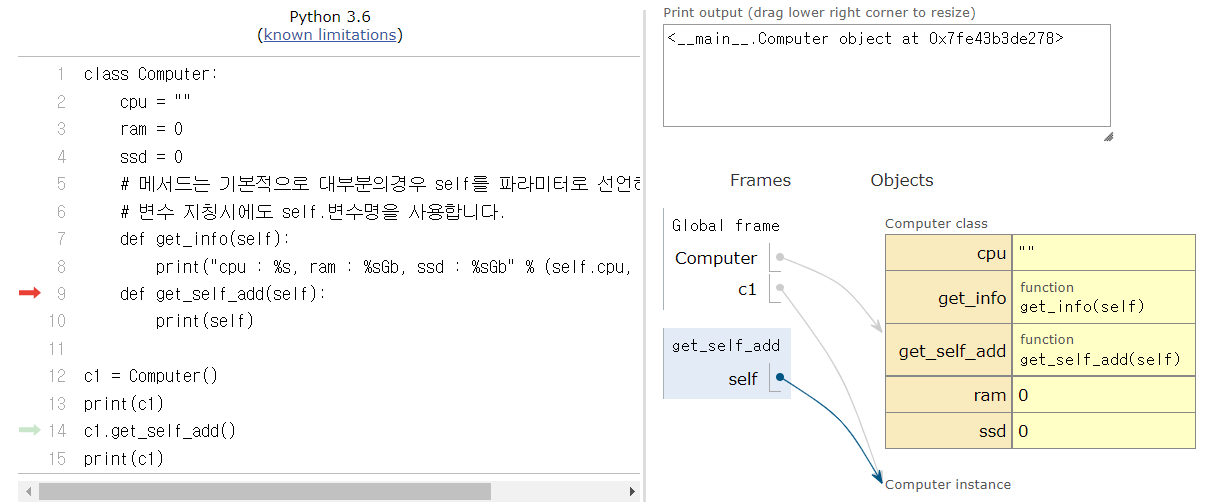 14번 c1.get_self_add()에서 c1의 주소값을 가지고 9번으로 돌아가 함수를 실행한다
