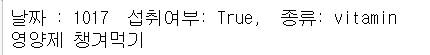 print("날짜 : %s 섭취여부: %s, 종류: %s" %(self.date, self.injest, self.type))