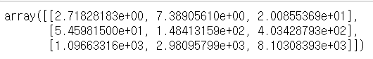 np.exp(arr) : 밑(base)이 자연상수 e 인 지수함수로 변환(y = e**x)