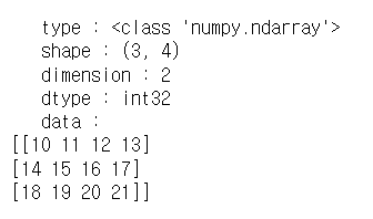 # Numpy 객체 정보를 확인하기 위한 사용자 함수 정의 : 객체타입, 구조, 차원, 데이터타입