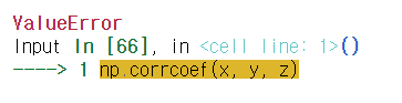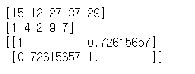 # numpy 함수 : np.corrcoef(arr1, arr2)