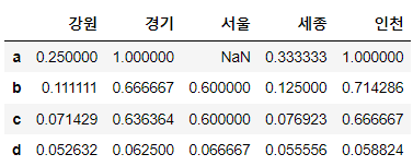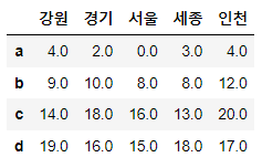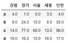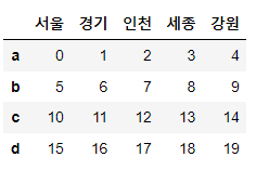 # 컬럼명을 서울, 경기, 인천으로, 로우명을 a, b, c로 가지고