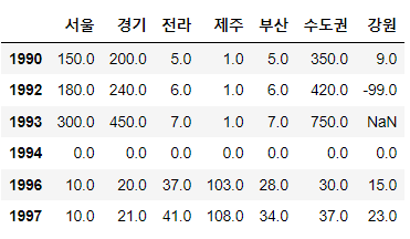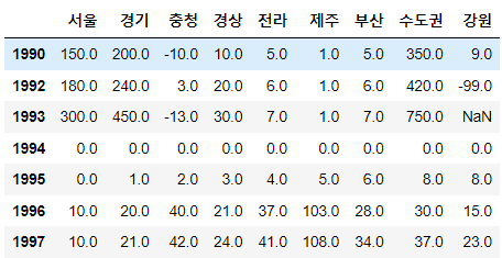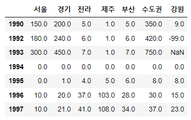'강원':[9.0, -99.0, np.NAN, 0.0, 8.0, 15.0, 23.0],