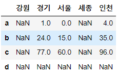 # 공통되지 않은 인덱스값과 컬럼값 -> NaN