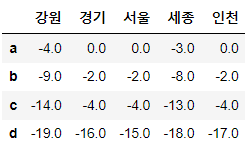 sample.drop(['제주', '강원'], axis=1, inplace=True)