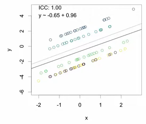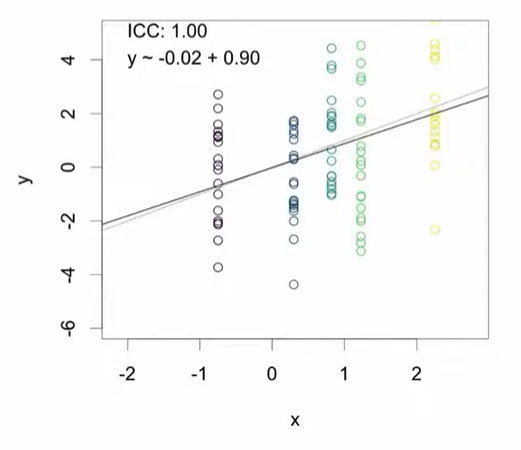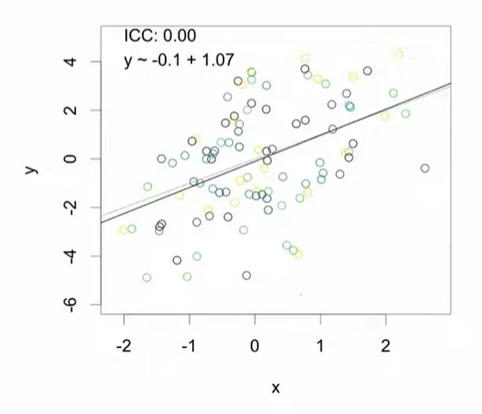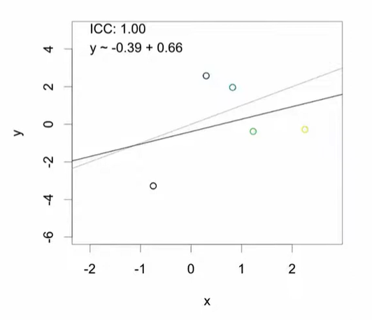 극단적인 경우(ICC = 1): 다섯 개의 클러스터에 각각 20개의 데이터가 존재한다면: 5개의 고유한 값만 존재하는 것과 같음 같은 클러스터 내의 또다른 데이터는 새로운 정보를 제공하지 않음. → 정확도가 떨어지는 추정