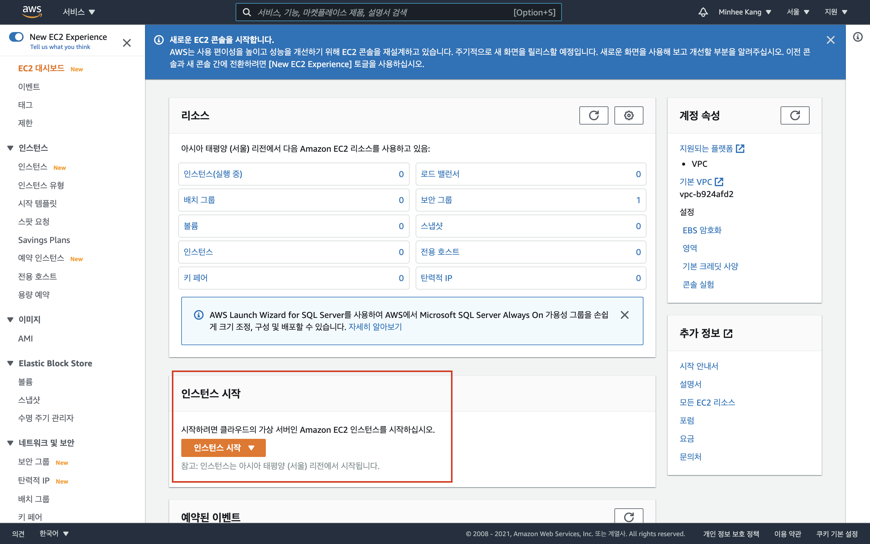 다음 그림은 EC2 대시보드 입니다. 오른쪽 상단의 리전을 확인해 보면 '서울' 리전이 현재 EC2의 리전으로 나타납니다.