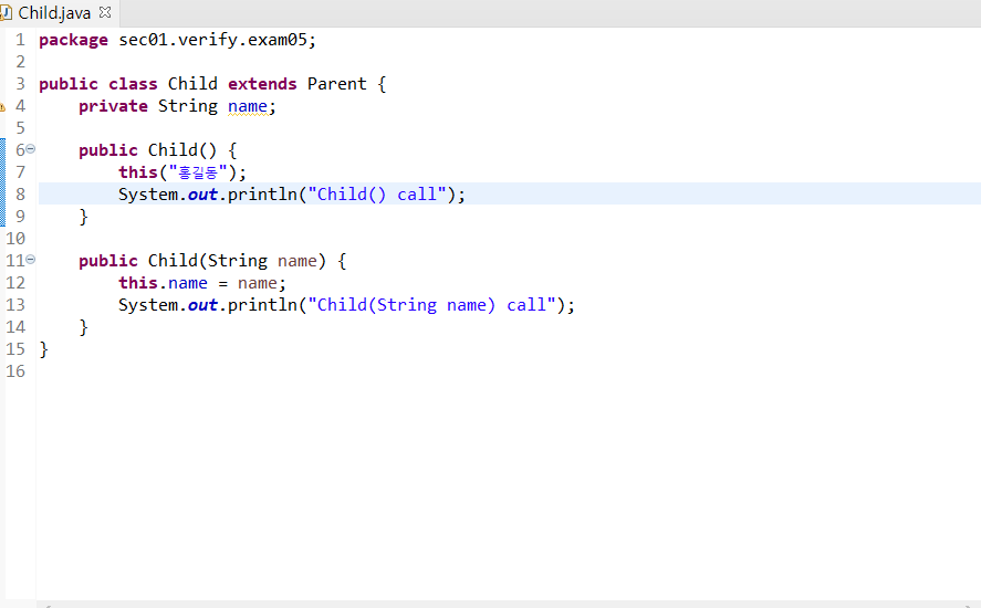 인자값을 하나 받는 생성자에서는 멤버변수 name에 인자값을 저장하고 Child(String name) call을 호출하고 있다.