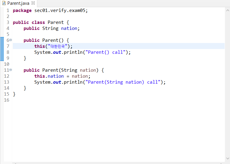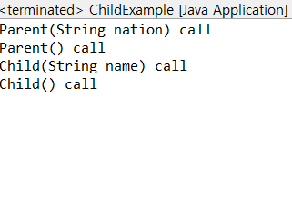 인자값을 하나 받는 생성자에서는 멤버변수 nation에 인자값을 저장하고 Parent(String nation) call을 호출하고 있다.