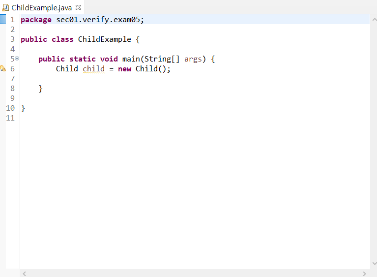 ChildExample 클래스의 main 메서드에서는 Child 클래스로 객체를 생성하고 있다.