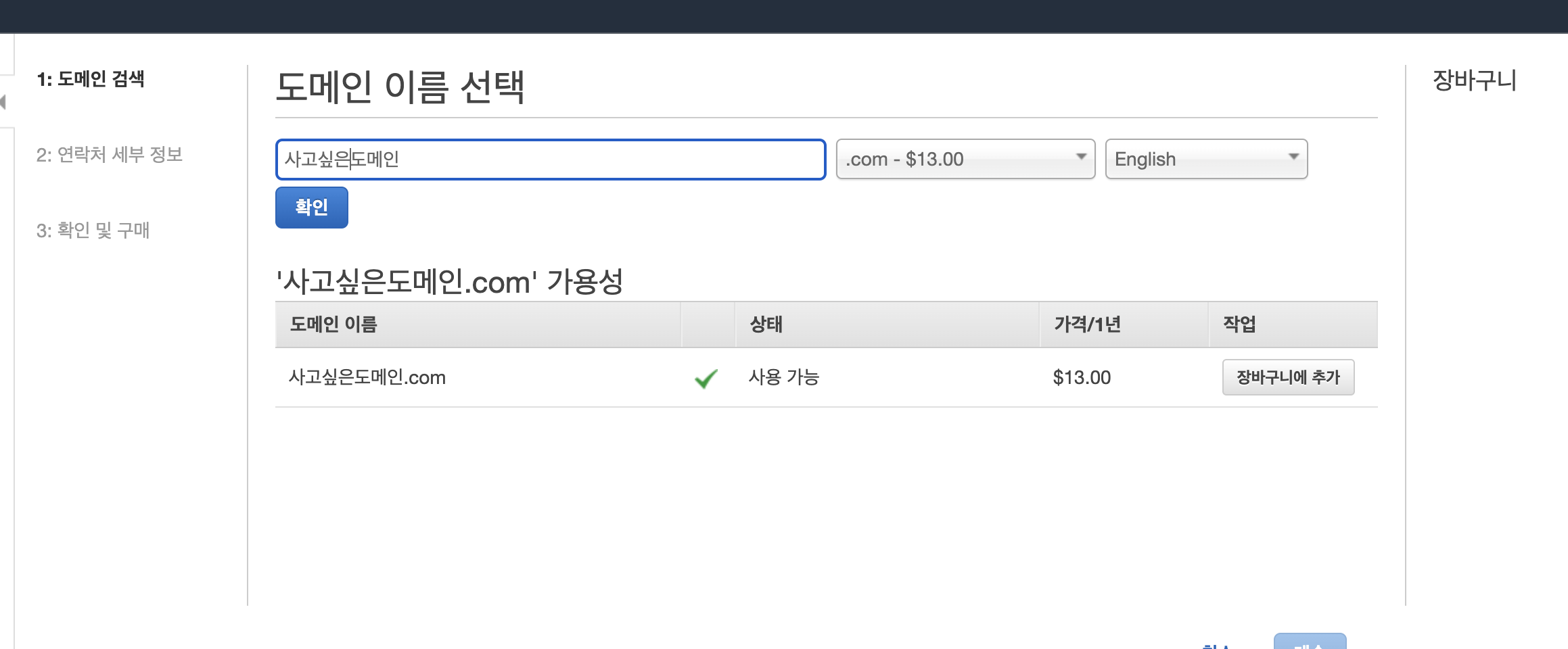 AWS에 로그인 한 뒤 route 53에 들어가 대시보드에서 본인이 구매하고자 하는 도메인을 우선 살 수 있는지 검색해 본다