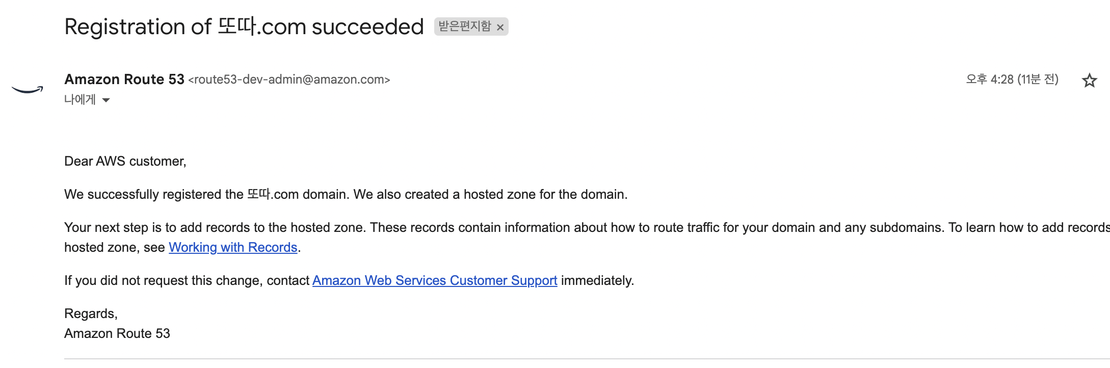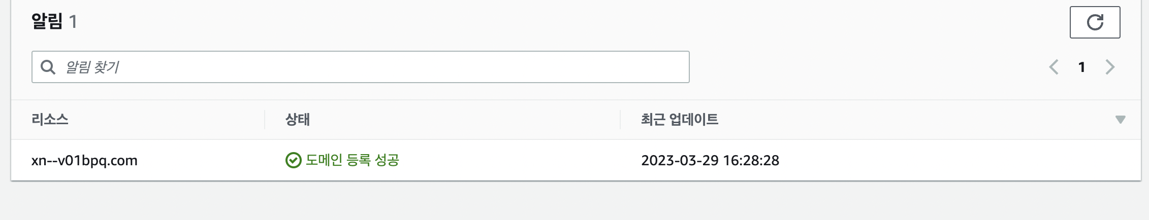 등록이 완료 됐으면 route 53 대시보드 알림 창에 다음과 같이 "도메인 등록 성공" 이라고 뜬다.