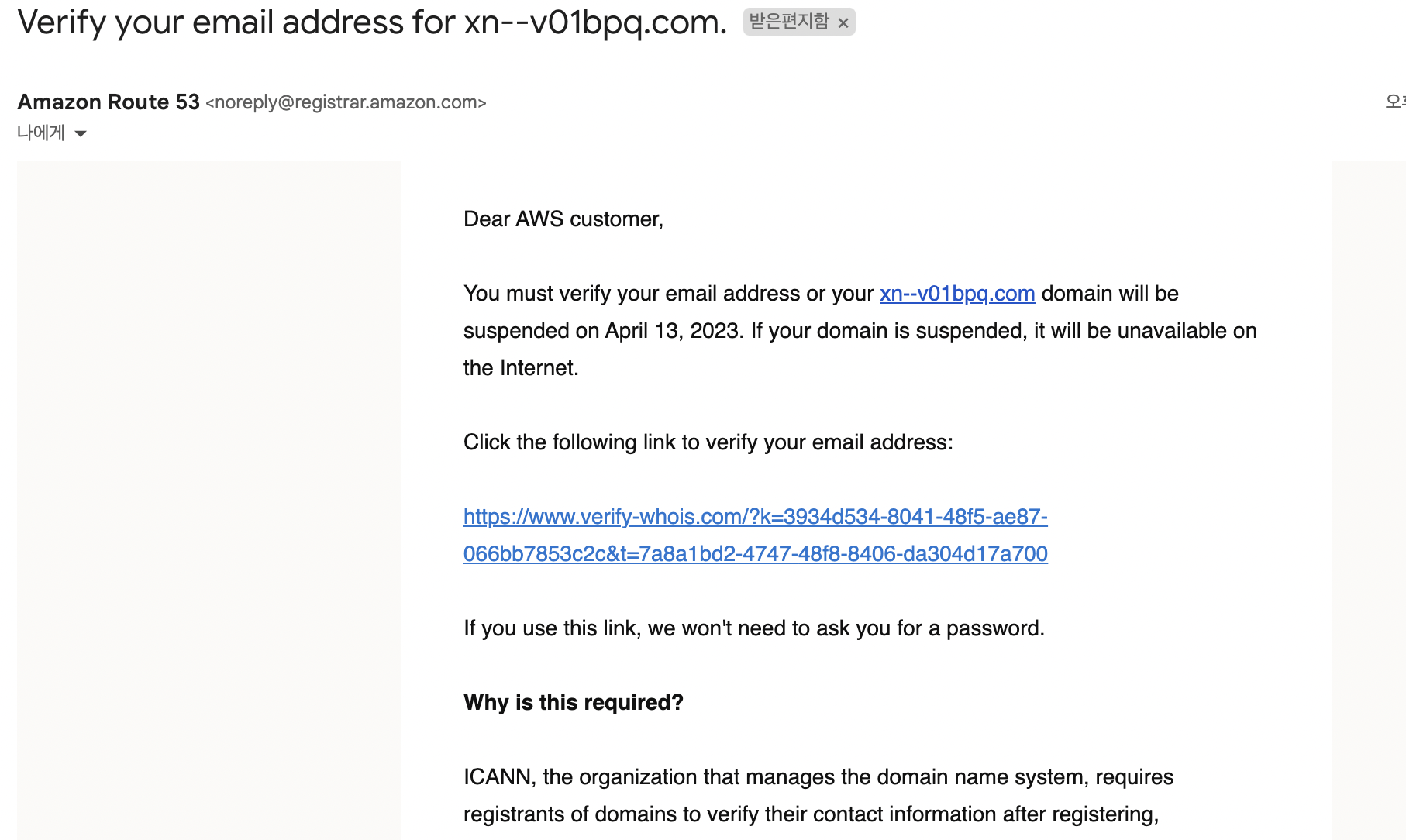 아래 메일은 방금 구매한 도메인을 한번 더 확실하게 확인하기 위한 메일로 같이 온 링크를 한번 클릭해서 확인절차를 진행하면 몇분 뒤에