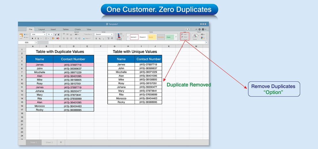 Duplicate data removal is essential to keep a single source of truth. Data cleansing techniques help remove all duplicates from your CRM. Techniques like fuzzy matching, rule-based matching, firmographic or probabilistic matching if applied correctly, helps remove any duplicates from your system.