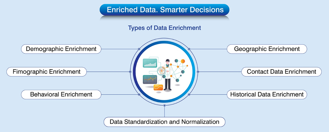 Data enrichment includes adding firmographic and demographic information, technographic traits, purchase history, engagement indicators and other such information. These help the sales team understand the customer batter and approach accordingly. Unlike cleansing, which fixes data quality issues, enrichment adds intelligence to already clean and validated data.