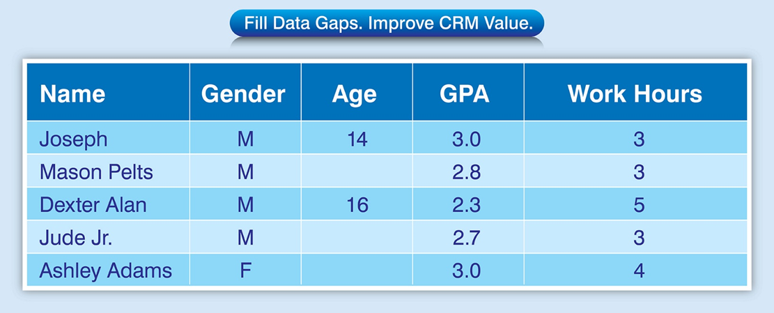 Incomplete CRM records lack complete information on your customer limiting visibility and marketing efforts. Your data is accurate and current, but if critical fields are missing, like contact records without roles or contact details without company name or even missing geographic data, makes targeting ineffective.