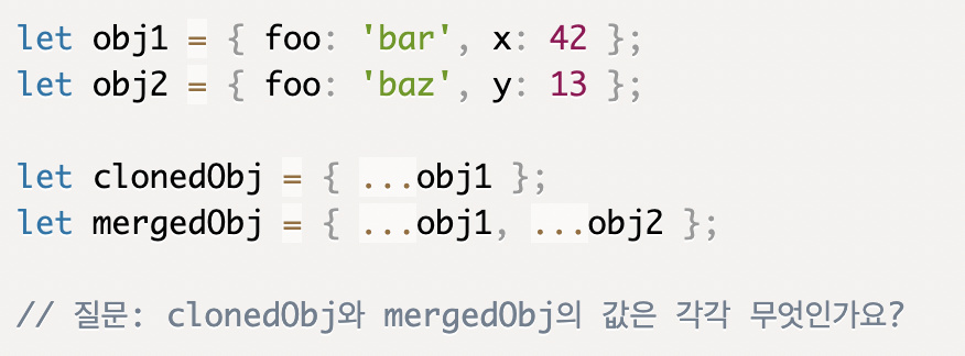 clonedObj // { foo: 'bar', x: 42 } , mergedObj // {{ foo: 'baz', x: 42, y: 13 }가 된다. 중복되는 foo에 대한 값을 넣어 주기 때문이다.