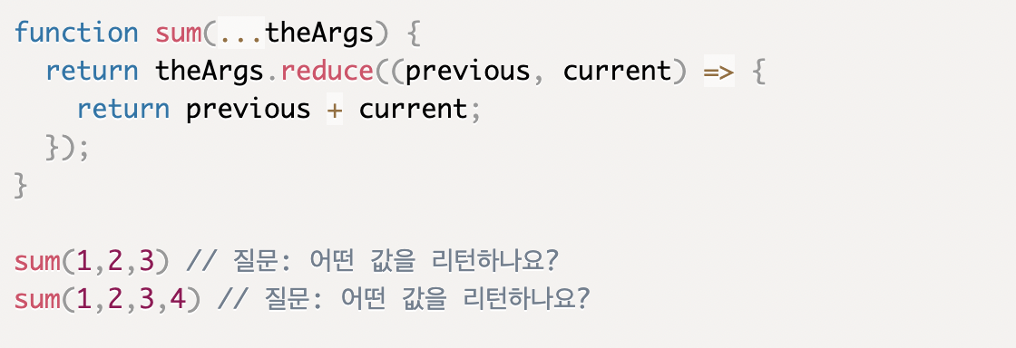 매개변수를 배열의 형태로 받아서 사용할 수 있다. 변수의 개수가 가변적일 때 유용하다. sum(1,2,3) // 6 , sum(1,2,3,4) // 10 이 된다.