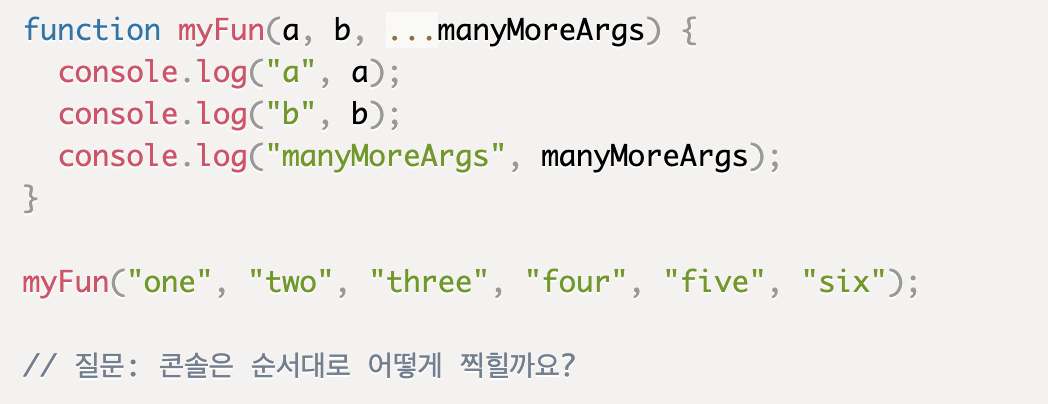 콘솔은 순서대로 'a' 'one' // 'b' 'two' // 'manyMoreArgs' { 'three', 'four', 'five', 'six') // 가 된다.
