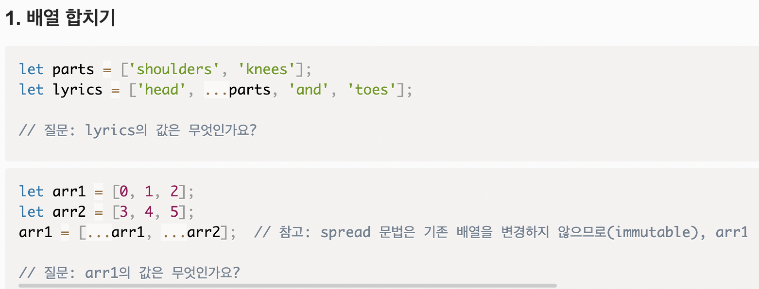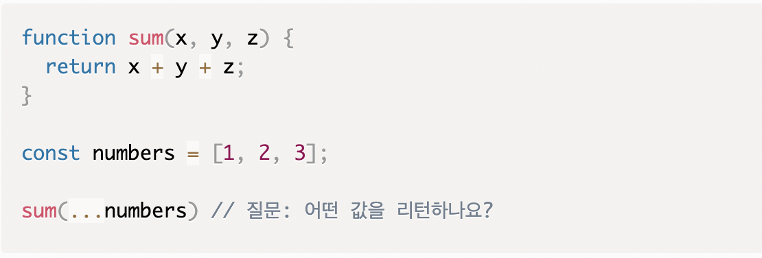 배열을 풀어서 인자로 전달하거나(배열), 배열을 풀어서 각각의 요소(객체)로 넣을 때에 사용한다. Sum(...numbers) // 6 이 된다.