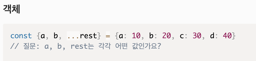 a // 10 , b // 20 , rest // {c: 30 , d: 40} 이 된다.