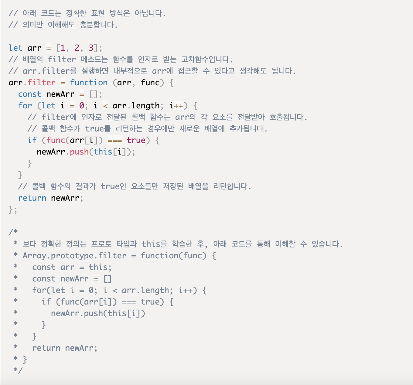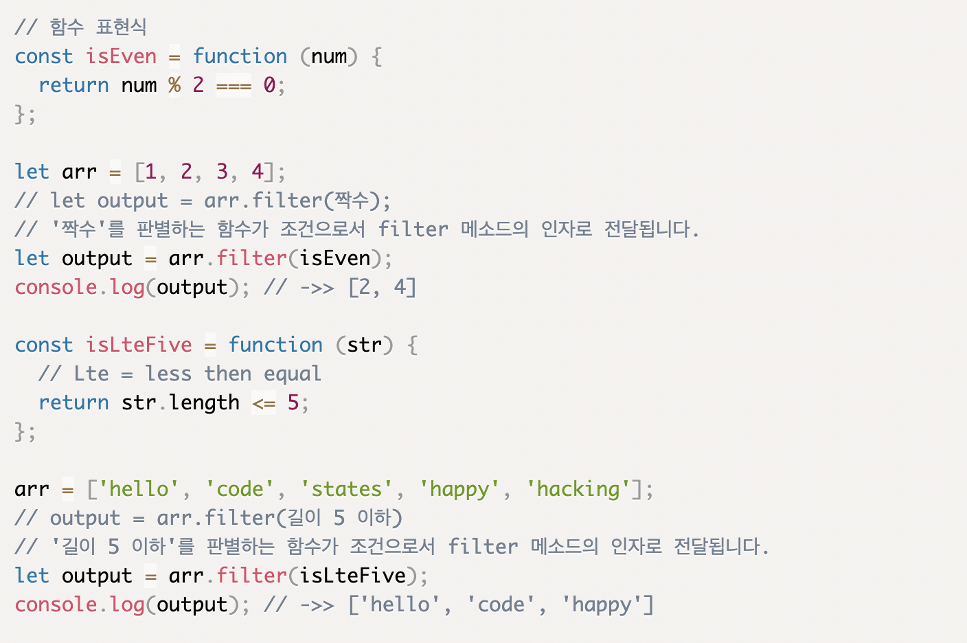 걸러내는 기준이 되는 특정 조건은 filter 메소드의 인자로 전달된다. 이때, 전달되는 조건은 함수의 형태이다. filter 메소드는, 걸러내기 위한 조건을 명시한 함수를 인자로 받기 때문에 고차함수이다. filter 메소드는 배열의 요소를, 인자로 전달되는 콜백 함수에 다시 전달한다. 콜백 함수는 전달받은 배열의 요소를 받아 함수를 실행하고, 콜백 함수 내부의 조건에 따라 참(true) 또는 거짓(false)을 리턴해야 한다. 적어도 filter 메소드는 이런 함수를 기대하고 있다.