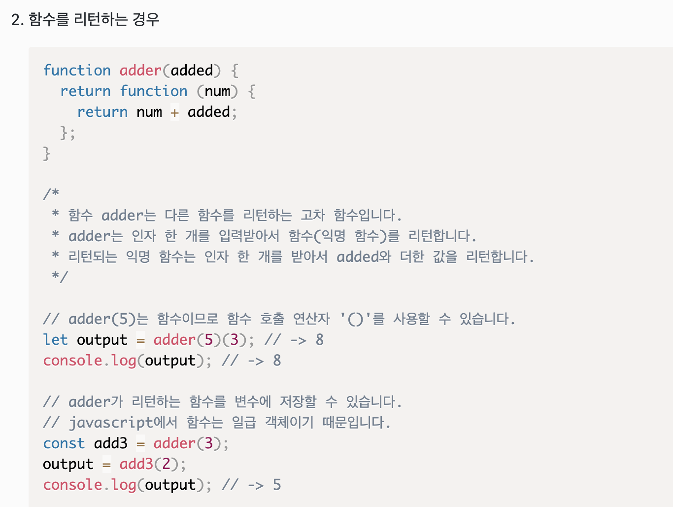 함수는 변수에 저장된 데이터를 인자로 받거나, 리턴 값으로 사용할 수 있다. 함수도 변수에 저장될 수 있기 때문에 함수를 인자로 받거나, 리턴 값으로 사용할 수 있다.