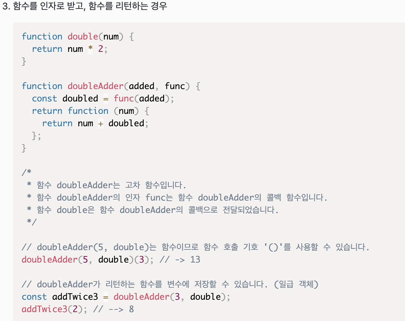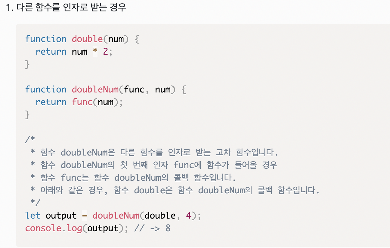 고차 함수(higher order function)는 함수를 인자(argument)로 받을 수 있고, 함수의 형태로 리턴할 수 있는 함수이다. 함수는 변수에 저장할 수 있고, 함수를 담은 변수를 인자로 전달받을 수 있다. 마찬가지로, 함수 내부에서 변수에 함수를 할당할 수 있고, 함수는 이 변수를 리턴할 수 있다. 여기서 변수에 할당하지 않고 함수를 바로 이용할 수 있는데, 어떤 고차 함수에 함수를 인자로 전달하고, 고차 함수는 함수 자체를 리턴한다. 변수가 빠졌을 뿐, 동일하게 동작한다. 이때, 다른 함수(caller)의 인자(argument)로 전달되는 함수를 콜백 함수(callback function)라고 한다. 콜백 함수를 전달받은 고차 함수는, 함수 내부에서 이 콜백 함수를 호출(invoke) 할 수 있고, caller는 조건에 따라 콜백 함수의 실행 여부를 결정할 수 있다. 아예 호출하지 않을 수도 있고, 여러 번 실행할 수도 있다.