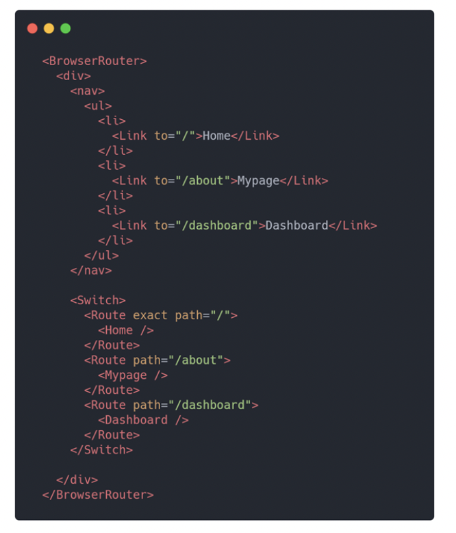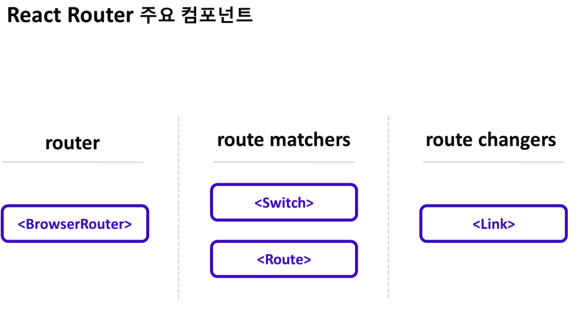 React Router의 주요 컴포넌트는 크게 3가지로 나눌 수 있다. 라우터 역할을 하는 BrowserRouter, 경로를 매칭해주는 Switch 와 Route, 그리고 경로를 변경하는 역할을 하는 Link 가 있다.