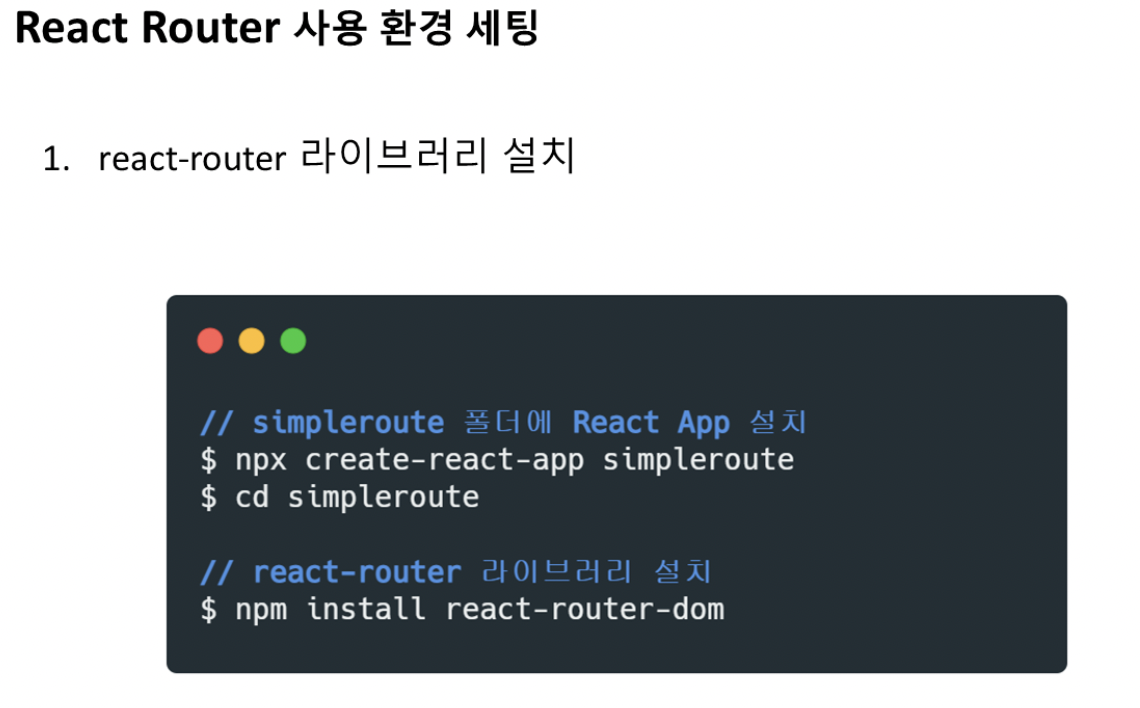 Twittler 와 같은 SPA 를 만들 때, 메인 트윗 모음 페이지, 알림 페이지, 마이 트윗 페이지 등의 화면이 필요하다. 또한 화면에 따라 "주소"도 달라지는데, 이렇게 다른 주소에 따라 다른 뷰를 보여주는 과정을 "경로에 따라 변경한다."라는 의미로 라우팅(Routing)이라고 한다. React자체에는 내장되지 않은 기능이기 때문에 직접 주소마다 다른 뷰를 보여줘야 한다. 그래서 React SPA에서는 라우팅을 위해 React Router를 사용하게 된다.