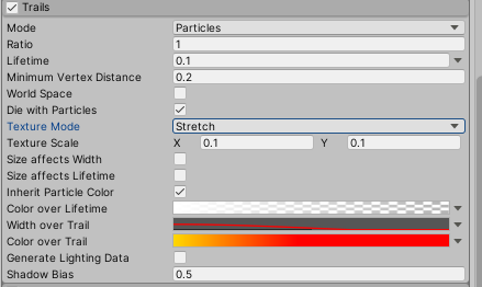 Trails을 활성화 한 후 Renderer > TrailMaterial에서 트레일의 마테리얼을 설정할 수 있다.