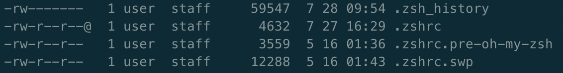 하지만 home 디렉토리에서 ls(목록 리스트를 보여주는 명령어)를 입력해도 .zshrc라는 파일이 보이지 않는데, 숨김처리가 되어있기 때문이다. 이렇게 파일의 이름 앞에 .이 써져있는것을 dot file이라고 부르며 자동으로 숨겨지게 된다. 이 숨겨진 파일을 보기 위해서는 ls -a라는 옵션을 준 명령어를 입력해준다. -a는 all을 뜻한다. (ls -al 옵션을 주면 모든 파일을 리스트 형식으로 보여준다.)