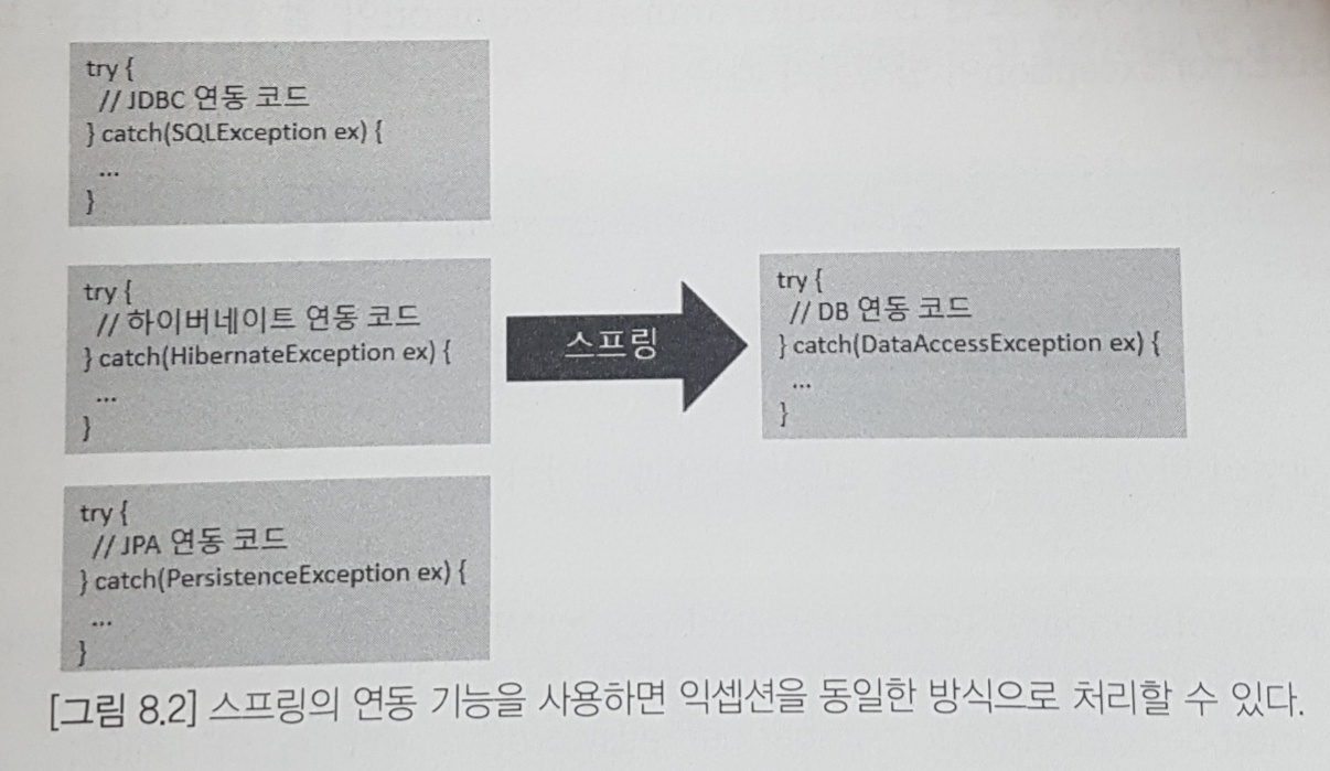 여기에서 주목해야 할 점은 JdbcTemplate의 메서드에서 사용한 SQL 쿼리에서 오류가 발생할 경우 이 오류 그대로 SQLException이 발생하는 대신 Spring에서 제공하는 Exception인 DataAccessException으로 변환된다는 점이다. Spring이 이와 같은 Exception 변환을 수행하는 이유는 어떤 DB 연동 기술(JDBC, JPA, Hibernate 등)을 사용하는지에 관계없이 동일한 코드로 Exception을 처리할 수 있게 하는 것에 있다.