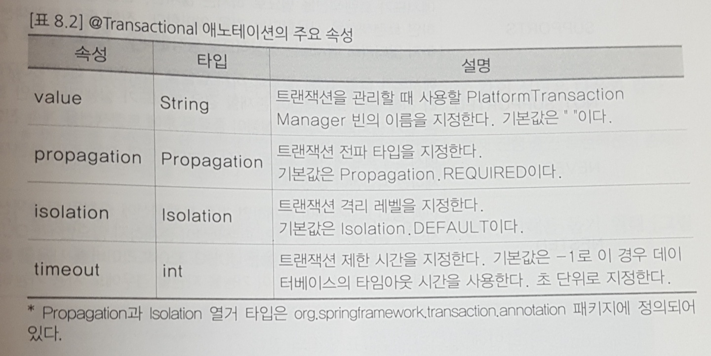 Spring에서의 트랜잭션 처리는 트랜잭션 범위에서 실행하고자 하는 메서드에게 @Transactional 어노테이션을 사용하고, @Configuration 클래스에서는 @EnableTransactionManagement 어노테이션과 PlatformTransactionManager 타입 Bean 메서드를 추가하는 방식으로 이루어진다.