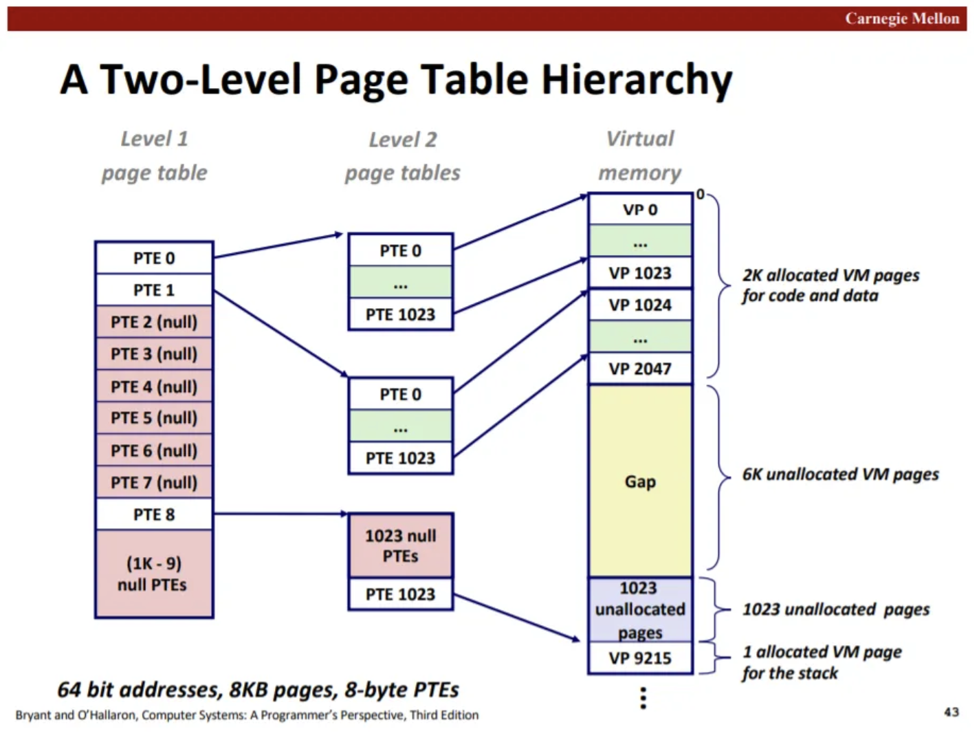 - 그러면 페이지 테이블에 저장해야할 데이터 양은 (페이지 수) (주소 자체 크기) = 2^20 2^2(32bit == 4byte) = 2^22 byte 2^22 byte == 4 2^10 2^10 byte == 4MB 그런데 이 사이즈는 한 페이지의 크기를 넘고, 페이지 테이블은 메모리에 저장되기 때문에, 여러 프레임에 저장되어야 함 그러면 mmu가 연산할 때 tlb miss가 나면 page table에서 index 접근으로 가져오는 것이 불가능해짐. 연속적으로 데이터가 올라와 있는게 아니기 때문임