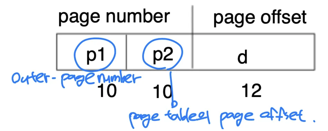 - outer-page table을 만들어서 page table의 page가 어느 frame에 저장되어 있는지 저장 그리고 전체 page table은 크기가 크기 때문에 disk로 내려버림 지금 참조되는 page table block만 메모리에 올려서 일을 처리 → 참조 지역성으로 해결 page number도 아래와 같이 관리