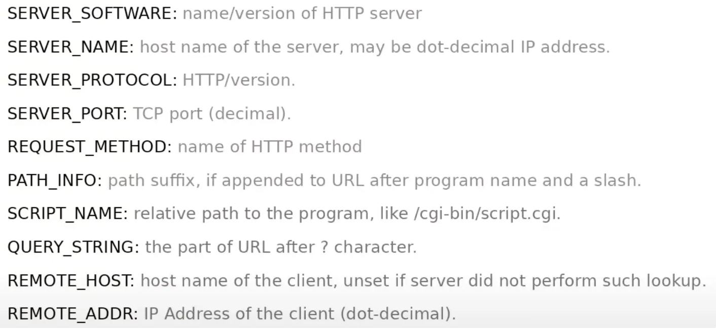 cgi는 common gateway interface의 줄임말입니다. 웹 서버에서 외부 스크립트로 전달되는 환경 변수의 이름과 목적에 대한 표준을 정한 것으로, 1997년에 만들어졌습니다. 아래는 환경변수의 일부분을 발췌한 내용입니다. query string과 같은 익숙한 정보들도 이것의 일부입니다.