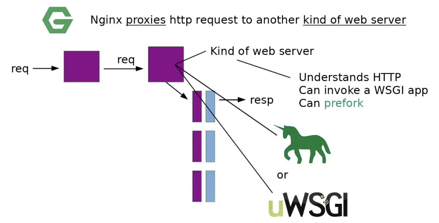 고전적으로 많이 사용해왔던 apache web server에서는 pre forking을 지원합니다. django와 같은 python application을 실행하기 위해 mod_wsgi를 지원하여 web server 내부에 application을 실행할 수 있게 도와줍니다. 하지만 nginx와 같은 web server는 application을 실행해주는 기능은 없습니다. nginx는 대신에 자신에게 들어온 request를 다른 web server에 전송하여 처리하도록 할 수 있습니다. 여기서 말하는 ‘다른 web server’가 바로 우리가 아는 gunicorn 같은 wsgi server입니다.