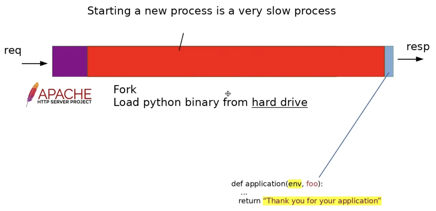 문제라면, web server가 스크립트를 동작시키는 방식이 문제가 된다는 것입니다. fork를 진행하고 새로운 process를 실행하기 위해서 disk에서 script를 읽어오는 것은 전체 과정에서 엄청 긴 시간을 차지합니다. 그도 그럴 수밖에 없는게, 하드디스크는 cpu와 memory에 비해 현저히 느리기 때문입니다. 매 request마다 이런 문제가 발생한다면 대용량 서버에서는 엄청난 병목이 발생할 것입니다.