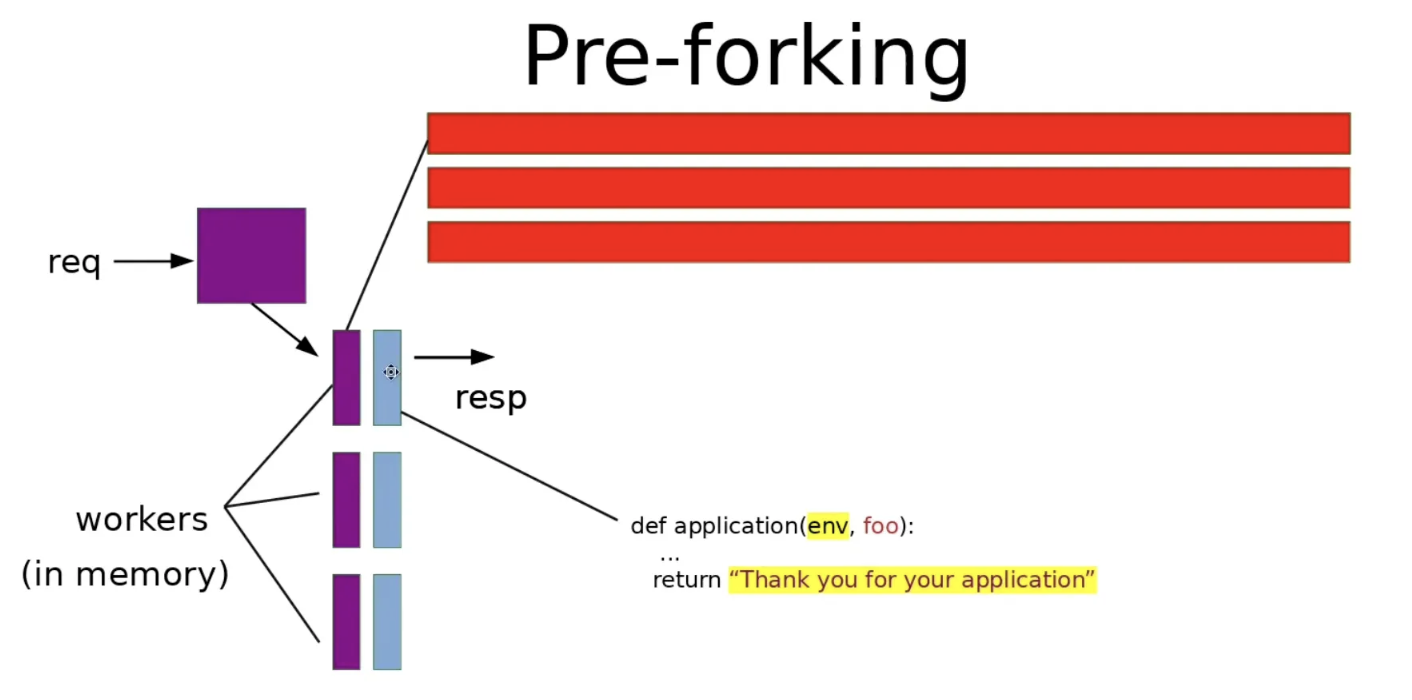 이 병목을 해결하고자 pre-forking 방식이 등장했습니다. web server가 idle 한 상황이나 처음에 시작될 때 미리 script를 fork해 두는 것입니다. 웹 서버는 worker에 script를 통해 만들어진 application을 대기시켜놓고 클라이언트의 요청이 들어오면 이를 처리하게 했습니다. 이러면 fork할 때 드는 overhead를 매 request마다 감수하지 않아도 되고, worker로 여러개로 구성하여 병렬적으로 요청을 처리해 병목 현상을 줄일 수 있습니다. pre-forking은 자식 process를 대기 시켜놓을 수 있어야 하기 때문에 response를 처리하더라도 process가 죽지 않습니다. 그래서 fork를 여러번 할 필요가 없는 것입니다.