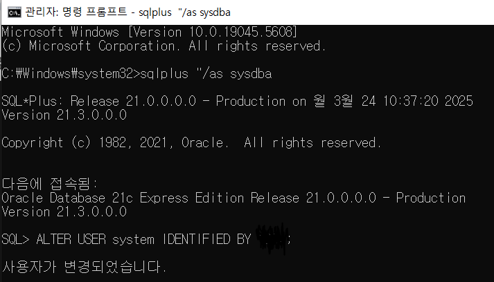 CMD > 관리자 권한 실행 > sqlplus "/as sysdba > 엔터