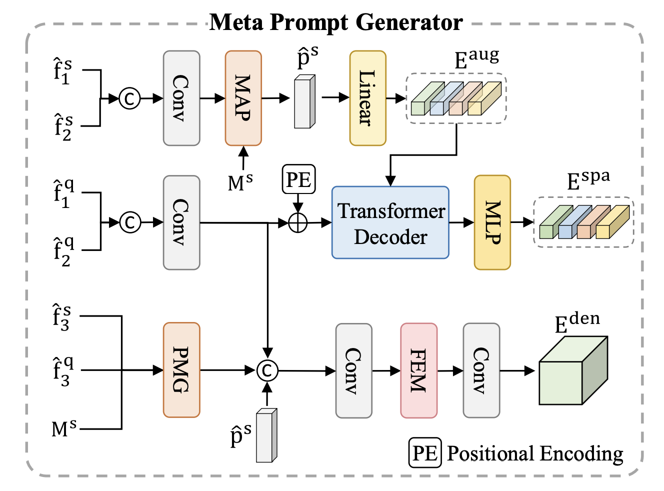 메타 학습(meta-learning) 방식을 통해 서포트-쿼리 쌍의 특징을 입력받아, SAM의 마스크 디코더가 요구하는 희소(sparse) 및 밀집(dense) 프롬프트 임베딩을 모두 생성한다.