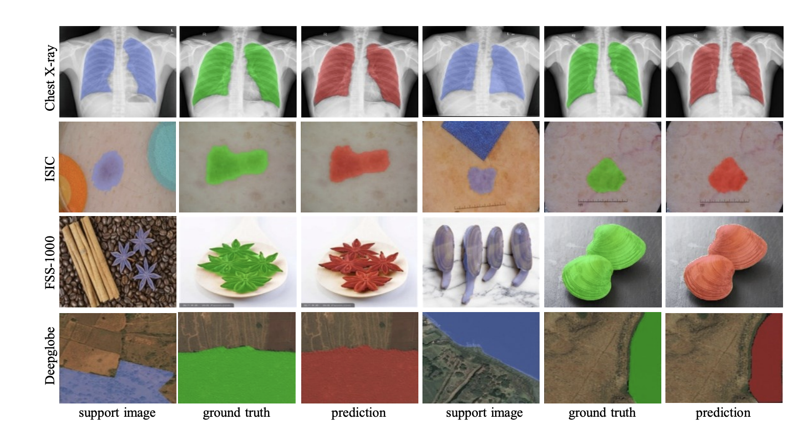 APSeg는 자연 이미지 데이터셋(PASCAL VOC)에서 학습 후, 이전에 보지 못한 4개의 타겟 도메인(Chest X-ray, ISIC, FSS-1000, Deepglobe)에서 평가되었다.