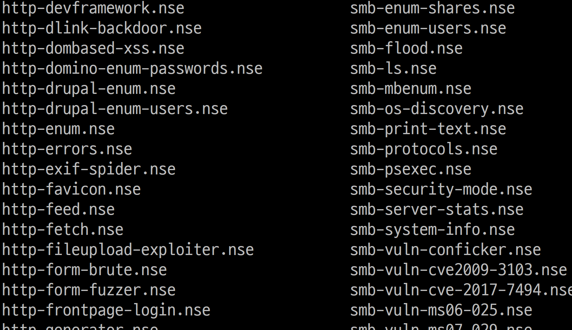 ls /usr/share/nmap/scripts 를 터미널에 입력하여 nmap이 제공하는 scripts를 확인해봅니다.