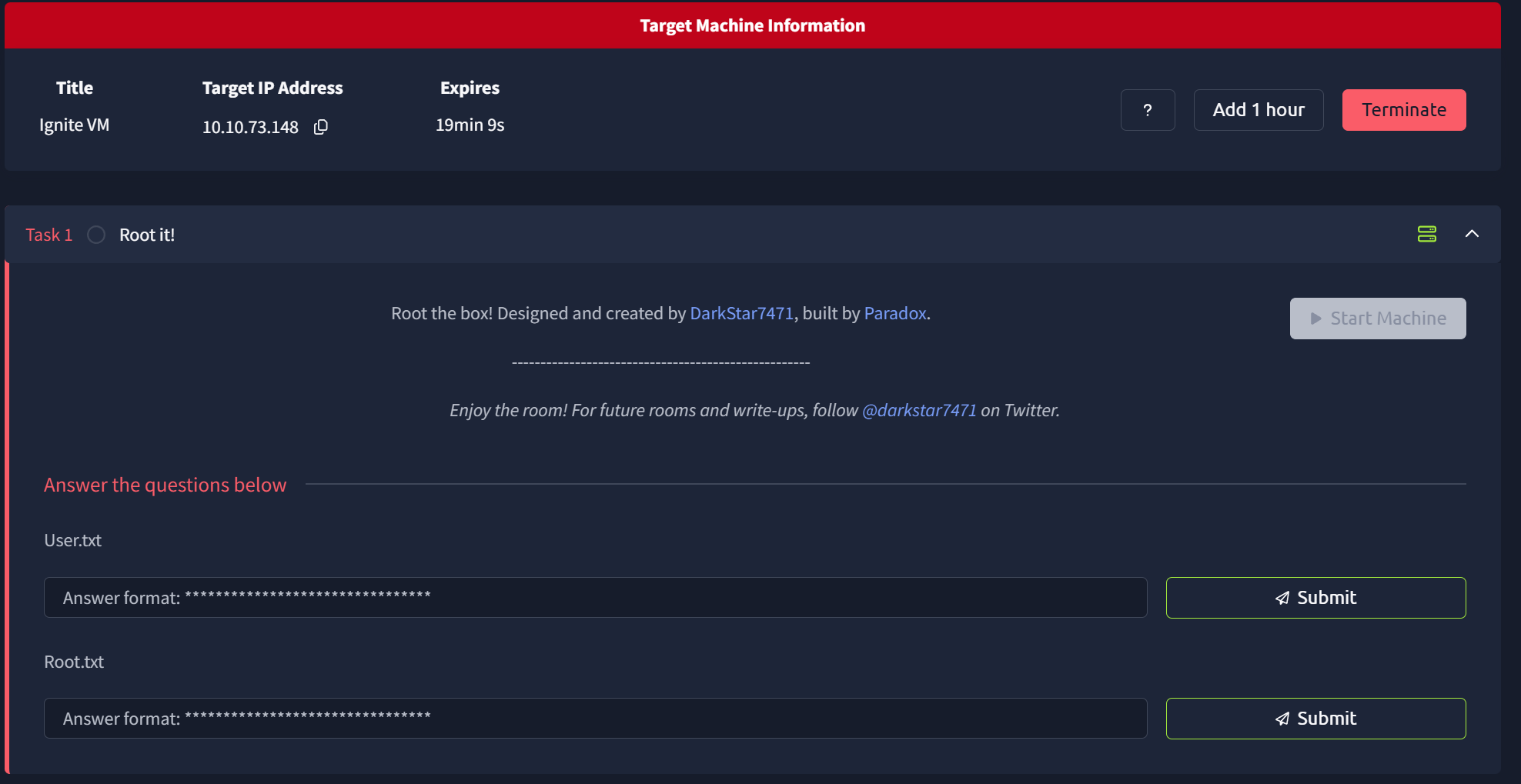 문제 사이트에 들어와서 Start Machine을 눌러 공격할 대상인 가상머신을 활성화하고, 공격할 대상의 IP를 확인합니다.