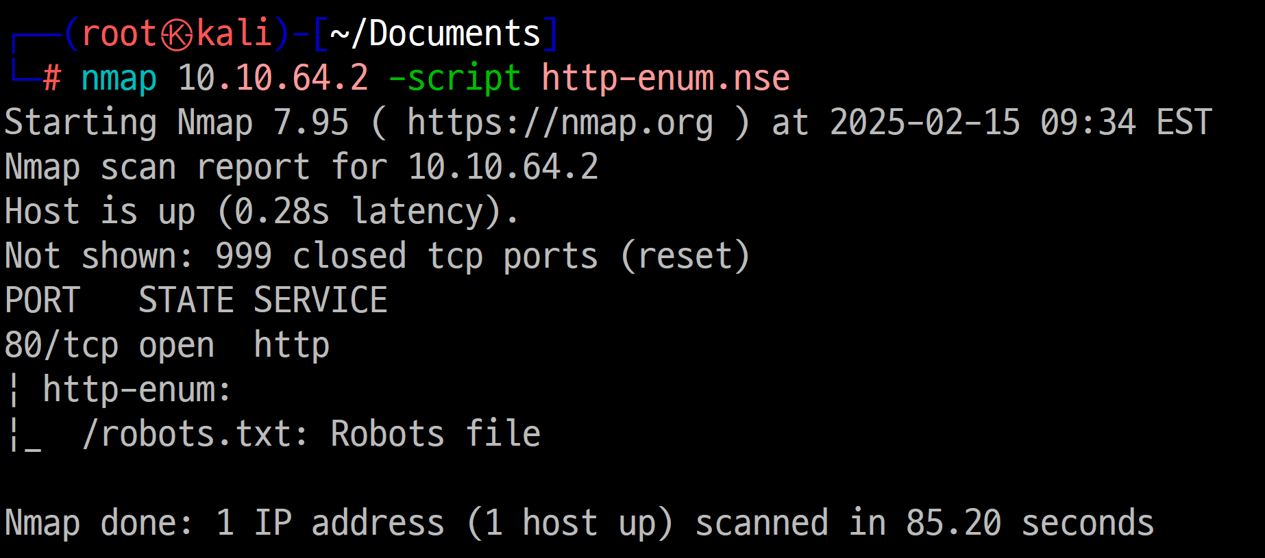 http-enum 스크립트가 /robots.txt라는 디렉토리를 찾아냈습니다.