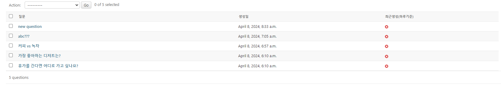 # Question의 필드를 설정, 순서를 바꾸면 바꾼 순서대로 표시됨.