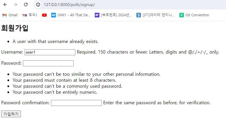 signup.html 템플릿 작성<h2>회원가입</h2>